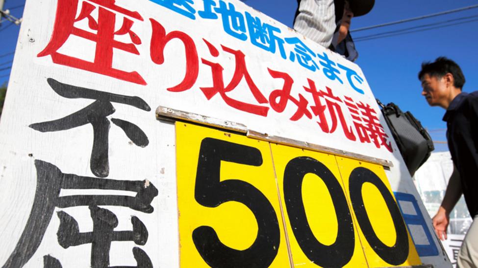 Los enojados que conmemoraban 500 días de protesta contra el plan estadounidense, han protagonizado una sentada frente a la puerta principal de la base Camp Schwab, sita en el noroeste de Okinawa, para impedir el paso de los vehículos de construcción.